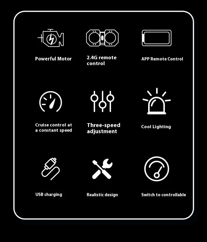 - ⚙️ Funkcje: jazda przód/tył, skręt lewo/prawo, zmiana prędkości, tempomat